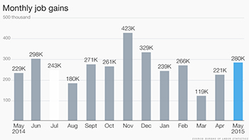 The U.S. Department of Labor said this morning that 280,000 new jobs were added to the rolls last month. Experts had predicted 58,000 fewer job gains.