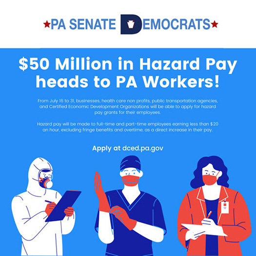 Governor Tom Wolf announced the availability of $50 million in grant funding to help employers provide hazard pay to employees in life-sustaining occupations during the COVID-19 pandemic. Hazard pay is intended to keep front-line employees working in vital industry sectors across Pennsylvania.