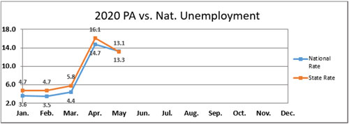 Pennsylvania’s seasonally adjusted unemployment rate fell to 13.1% in May 2020, down three percentage points from its revised record high in the seasonally adjusted series of 16.1% in April 2020 (dates back to 1976), and below the national rate of 13.3% in May 2020. The decrease in May 2020 follows on the heels of growth of 11.4% in the commonwealth’s rate over the previous two months. This and the other changes to data noted in this update reflect the progression of Pennsylvania’s employment situation through the coronavirus pandemic (please see the *footnote below).