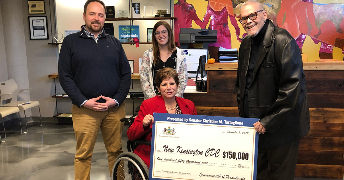 Philadelphia, PA, December 3, 2019 – State Senator Christine Tartaglione (D-Philadelphia) delivered a $150,000 Pennsylvania grant today to the New Kensington Community Development Corporation (NKCDC) to help the non-profit organization redevelop two formerly vacant storefronts at 2513-15 Frankford Ave. The adjoining properties will be converted into affordable, neighborhood-oriented commercial and residential space that will revitalize the surrounding business corridor.